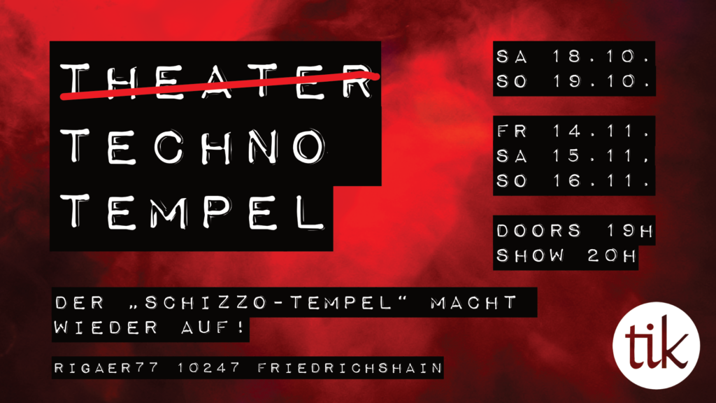 Es gibt kaum einen geeigneteren Ort für einen Blick zurück in die 90er in der Rigaer als unser Theater in den Räumen des ehemaligen Clubs „Schizzo-Tempel“. Mit Theater Techno Tempel versetzt euch das Ensemble mithilfe von Zeitzeug*innen einerseits zurück in diese Zeit und stellt gleichzeitg den Bezug zum Hier-Heute her. Eines unser Themen im tik ist der Kiez, ein anderes die gesellschaftlichen Entwicklungen. Ihr seid herzlich eingeladen zu einer Performance, die euch wortwörtlich dabeisein lässt.